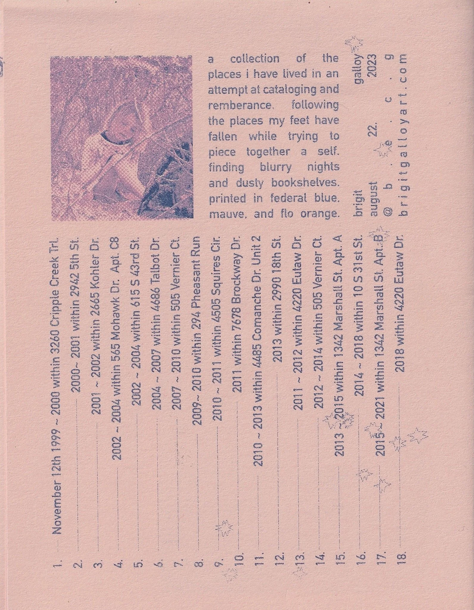 Categories: Select a Category clay prints zines things i make clay | prints | zines | wood fired charm jar copper jar charm planter vibrations charm mug blue star goblet stars cup blue charm mug gateway paths & walkways mug clouds and fish mug hands moving castles, rain, goblets, flowers, fish lilies and pea shoots cherry bowl black white and blue trace monotype with a smile dawdle places between I wander there transmitted laced intaglio with the kids garlic jar mole ants & lilies goblet set blue bowl set blue star jar seeds here jar blue cherries jar teeny dark blue jar singing clams jar sweetness bowl blue stars mug stars mug red bowl